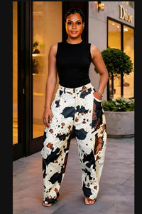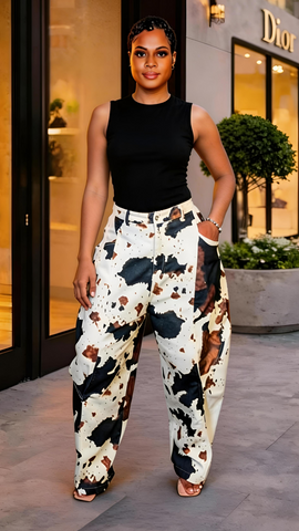 Introducing our Cow Girlies Pants, the perfect combination of fashion and comfort. Featuring a baggy fit and cow print denim, these jeans are sure to make a statement. Designed for ultimate style and wearability, make a bold statement wherever you go.