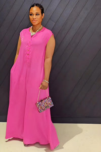 This wide leg jumpsuit is made of lightweight satin woven fabric, featuring a sleeveless design and a button closure at the front. Its rounded neckline and side slant pockets add convenience and style. Perfect for those who love a touch of pink and a comfortable, flattering fit.
