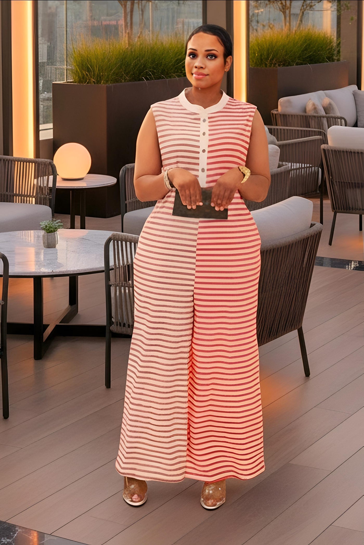 This jumpsuit features an oversized design that exudes a contemporary style. The sleeveless design and wide leg provide a cool and comfortable fit. The striped print offers a classic look, while the color block design adds a touch of visual interest.