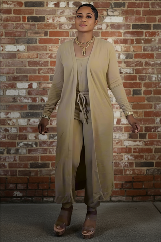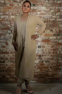 Elevate your style with our JESSICA Jumpsuit Set in a chic tan color. This set includes a versatile jumpsuit and a matching cardigan for effortless layering. Experience comfort and fashion with this must-have ensemble.