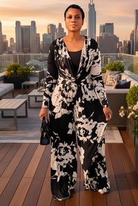 Good stretch, Inseam is 33 inches. Crop Top, Cowl neckline, lond sleeves. High waisted pants, elastic waistband, pockets. Wide legs, No closure.
