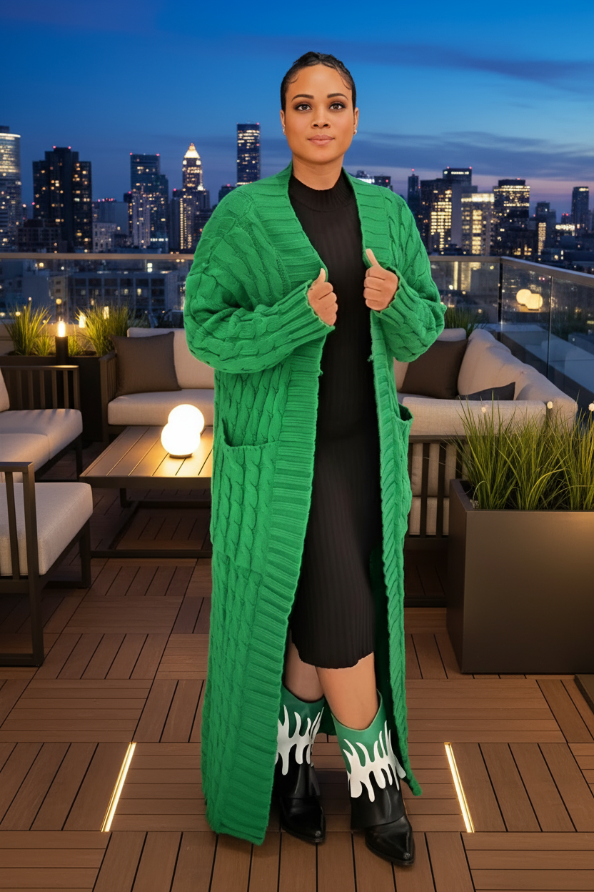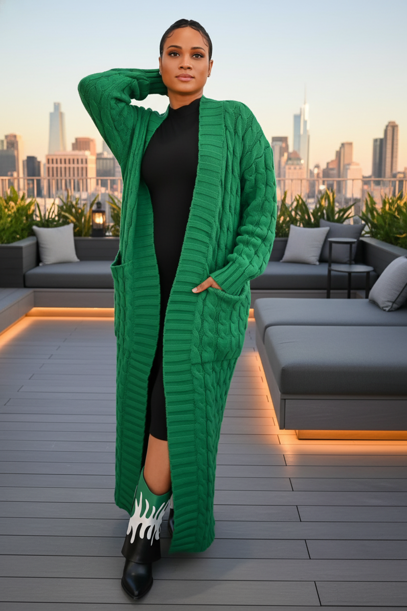 Runs oversized with stretch. One size fit most.Open Knitted Cardigan with side pockets.