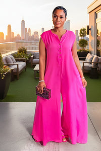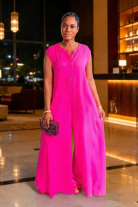 This wide leg jumpsuit is made of lightweight satin woven fabric, featuring a sleeveless design and a button closure at the front. Its rounded neckline and side slant pockets add convenience and style. Perfect for those who love a touch of pink and a comfortable, flattering fit.