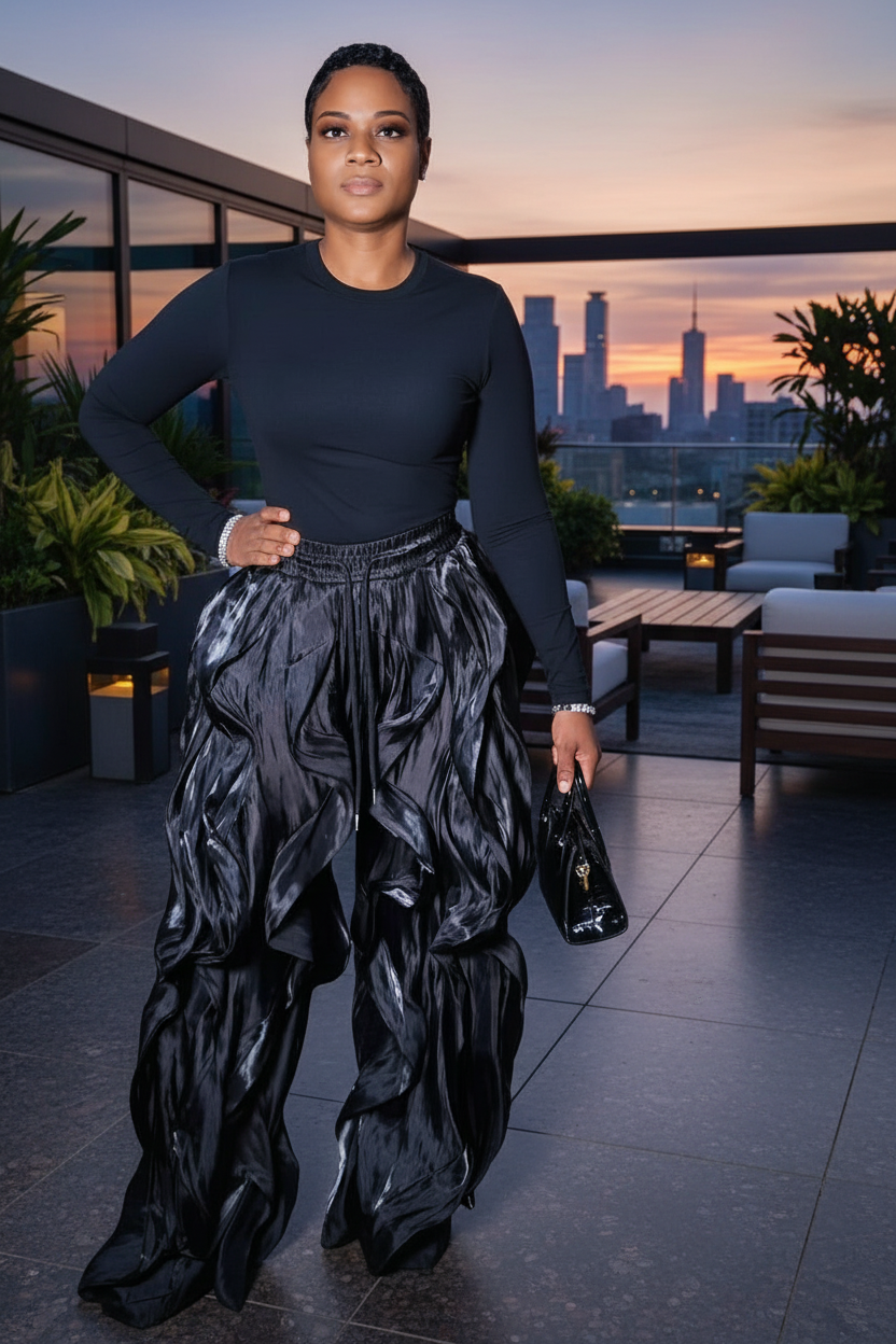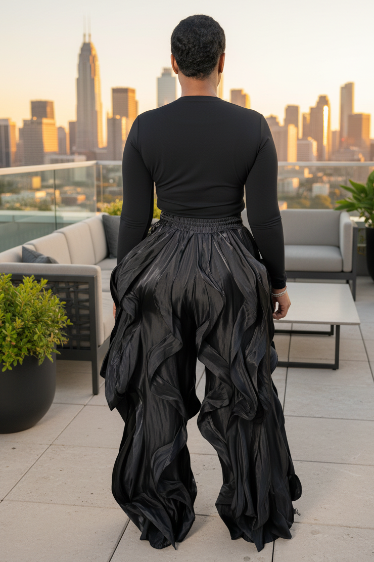 Upgrade your wardrobe with our Midnight Waves Pants. Featuring oversized joggers, ruffled details, and a lightweight design, these pants are perfect for any occasion. The elastic waistband and drawstring ensure a comfortable fit, while the ankle hems add a touch of style. Elevate your fashion game with these statement pants. High shine fabric.