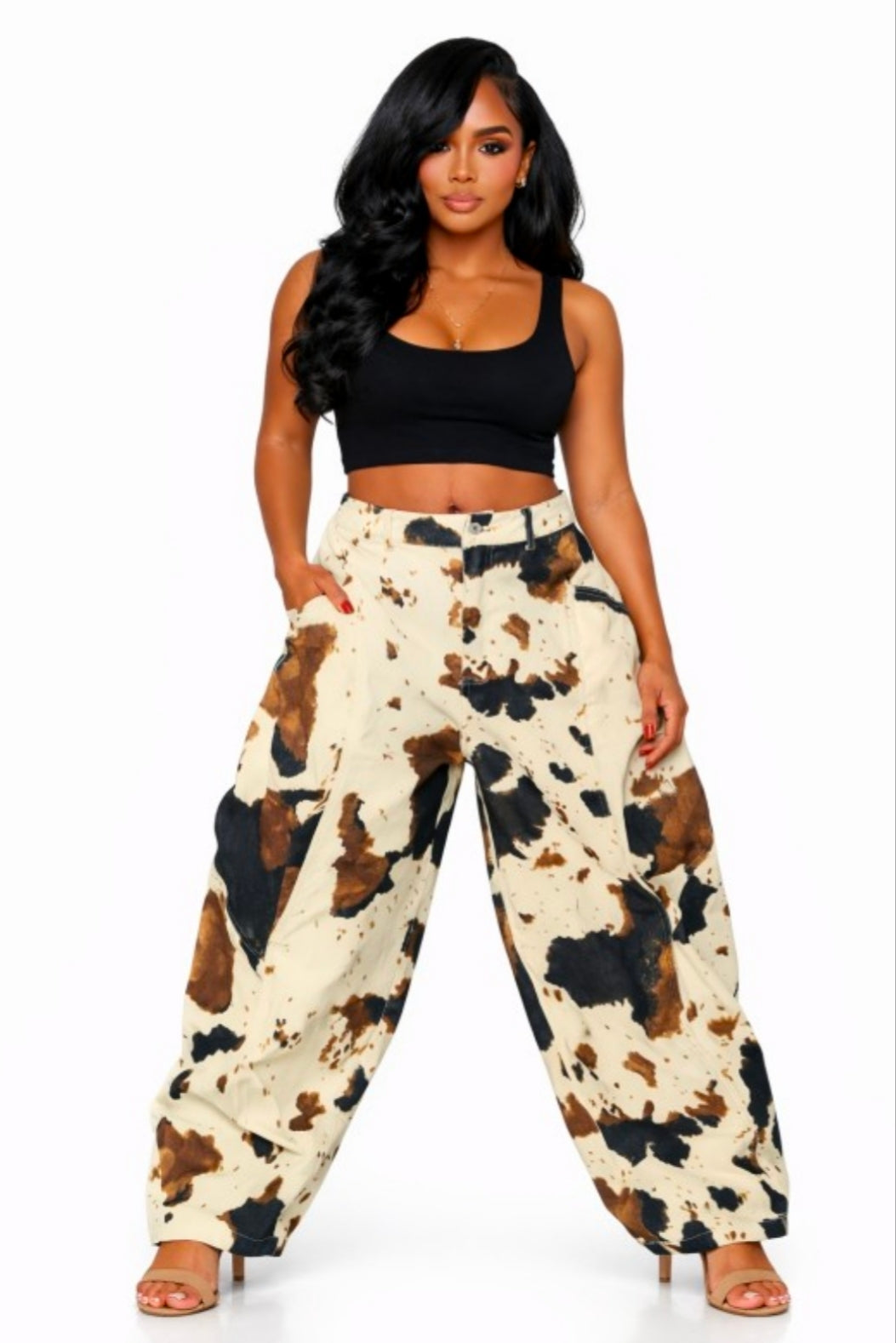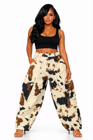 Introducing our Cow Girlies Pants, the perfect combination of fashion and comfort. Featuring a baggy fit and cow print denim, these jeans are sure to make a statement. Designed for ultimate style and wearability, make a bold statement wherever you go.